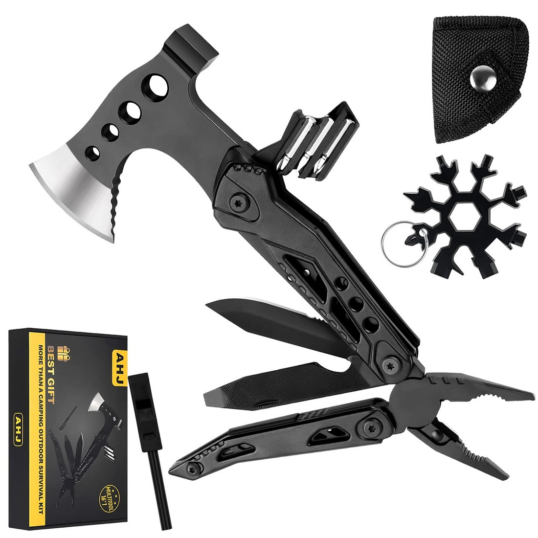 34-in-1 multi-tool tool: this outdoor survival kit consists of 34 different tools, including hammer, axe, pliers, main knife, screwdriver, bottle opener, whistle, magnesium rod, fish descaler and 18-in-1 snowflake multitool, nylon protective cover to ensure safety.