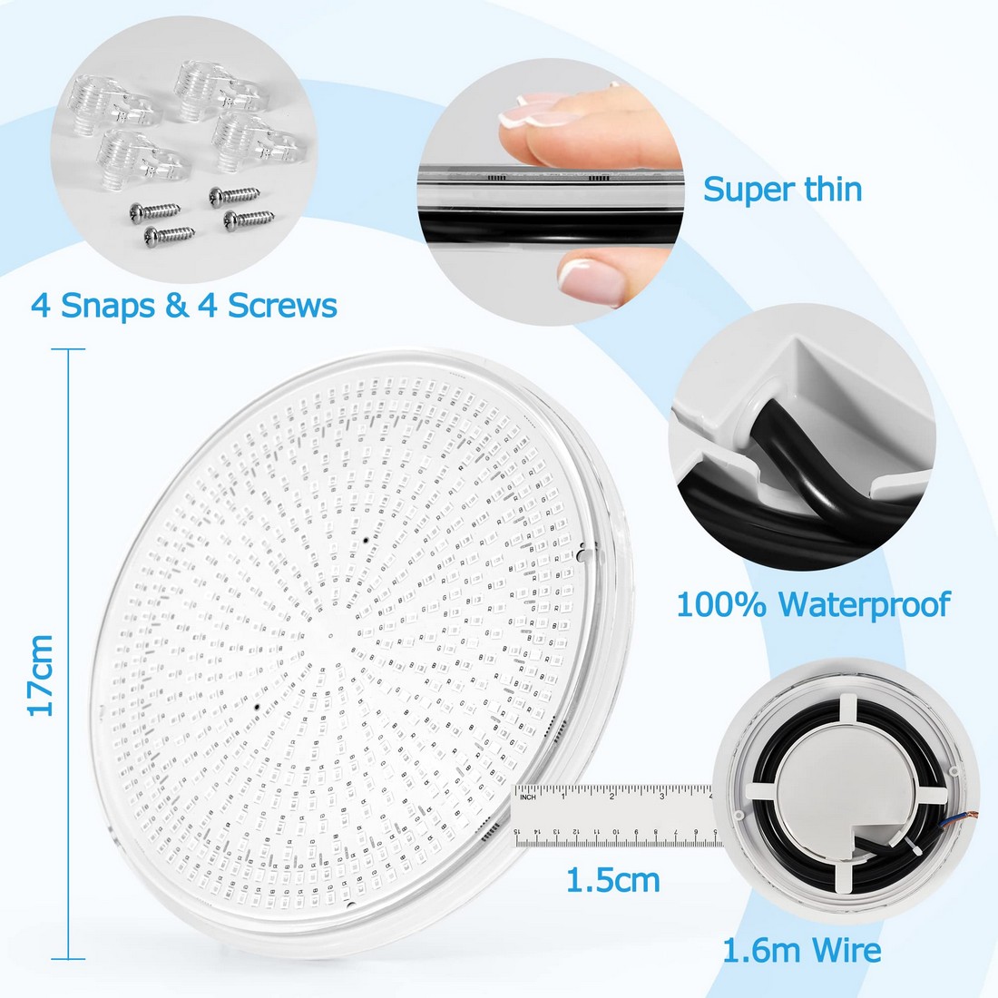 【Projecteur de Piscine Multicolore】 -- La lumière pour piscine dispose de 16 modes d''éclairage au choix, dont 7 modes statiques et 3 modes dynamiques.La télécommande se souvient de la dernière couleur et la distance de contrôle efficace de l''antenne est de 20 à 50 m.La durée de vie moyenne des perles lumineuses de haute qualité est de 50000 heures.